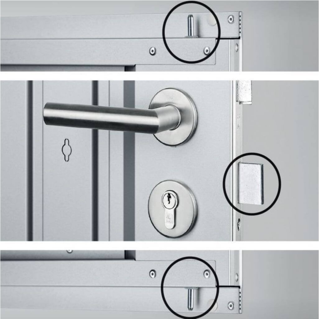 - Domek na nářadí AVANTGARDE splňuje nejvyšší nároky na bezpečnost - 3 násobná závora s dveřním kováním, normované zamykání s klikou z ušlechtilé oceli, normovaný cylindr a rezervní klíč.