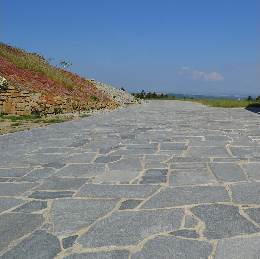 Kora Mavi pojezdová dlažba má tloušťku 3 - 5 cm a velikost kamenů je různá. Je ovšem možné tuto dlažbu využít i na zahradní chodníčky s pokládkou do štěrku.
