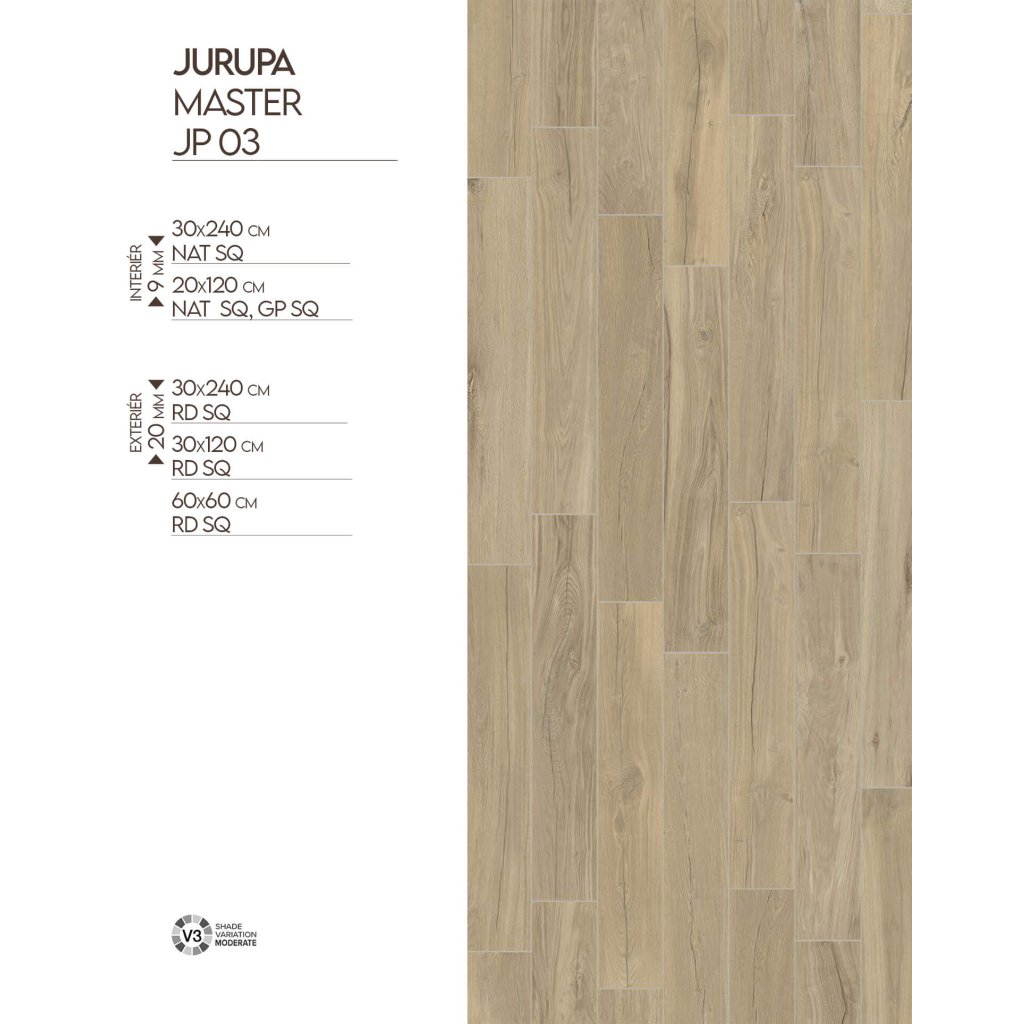 Kolekce Jurupa od Mirage představuje typ JP 03 Master, který zachycuje krásu jemně opracovaného dřeva v elegantním designu. Jeho textura a neutrální tóny vytvářejí útulnou atmosféru, která zapadne do různorodých prostředí. Tento typ dlažby je vyráběn ve dvou tloušťkách, což zajišťuje širokou škálu využití. Tloušťka 0,9 cm je skvělou volbou pro interiéry jako dlažba či obklad a v exteriérech nachází uplatnění jako obklad na fasády nebo stěny. Silnější varianta s tloušťkou 2 cm je perfektní pro venkovní dlažby na terasách, zahradních stezkách nebo v okolí bazénů, kde je klíčová odolnost a stabilita. JP 03 Master nabízí univerzálnost a praktičnost v kombinaci s vizuální estetikou, která oslní jak v moderních, tak v klasických prostorech.