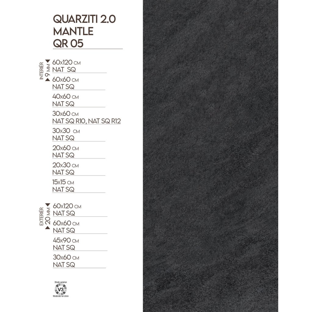 Quarziti 2.0 QR 05 Mantle vnáší do prostoru dramatickou hloubku téměř černého povrchu s přirozenými nuancemi kamenné struktury. Tato keramická dlažba a obklad propojuje sofistikovaný design s vysokou odolností vůči opotřebení, vlhkosti i teplotním výkyvům. V exteriéru je ideální volbou jako bazénová dlažba, obklad kolem krbu nebo sokl, kde nejen podtrhne architektonický styl, ale také zajistí bezpečný a komfortní povrch. Nabídka formátů umožňuje přizpůsobit pokládku individuálním požadavkům – od menších dekorativních prvků až po velkoformátová řešení pro jednolitý vzhled.