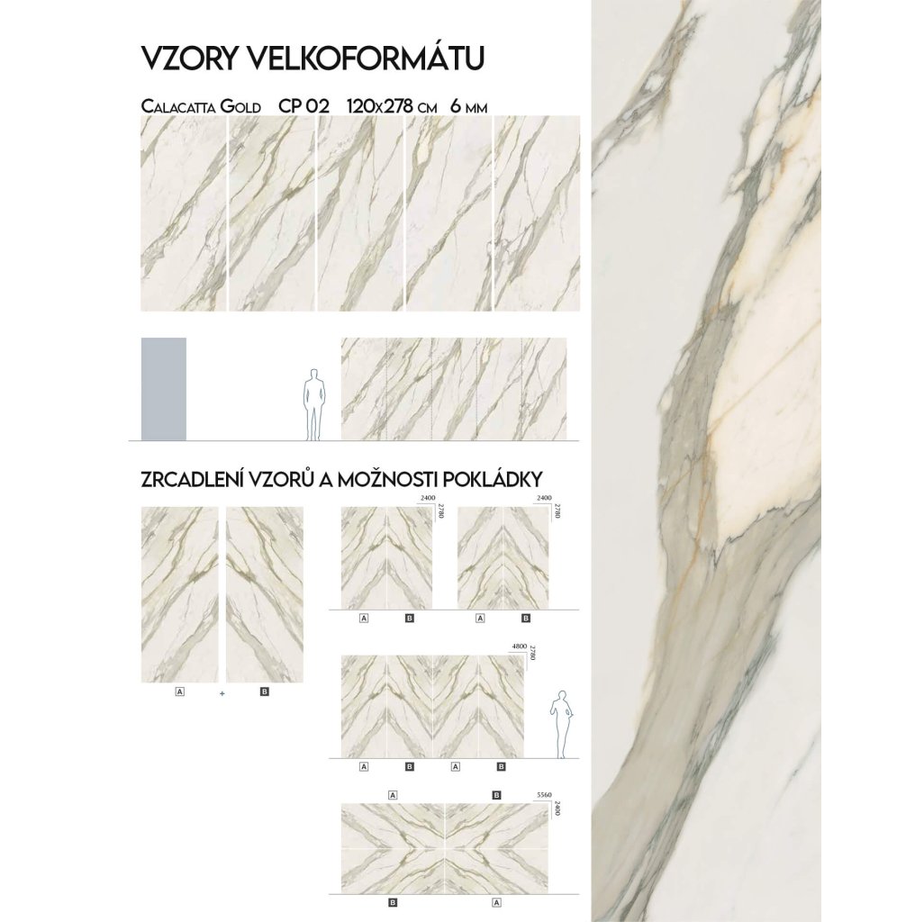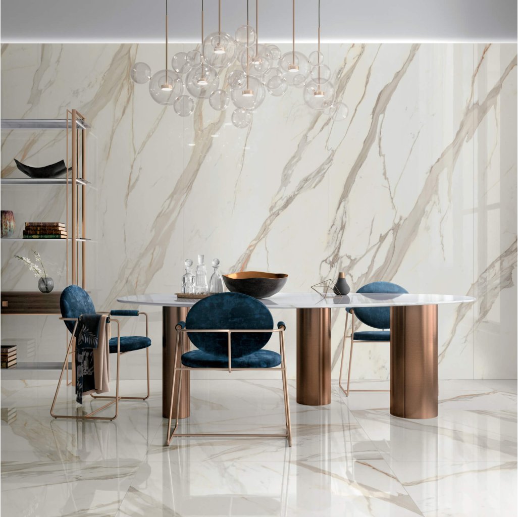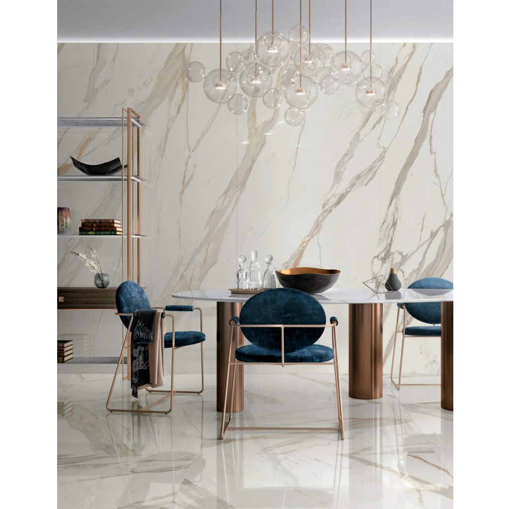 Jewels 2.0 CP 02 Calacatta Gold zaujme svým noblesním dekorem výrazných zlatých žil na světlém povrchu. Hladká úprava zdůrazňuje kontrast mezi barvami a přispívá k oslňujícímu dojmu. Velkoformátové provedení s minimálními spárami je ideální volbou pro prostorné koupelny, kuchyně i obývací pokoje. V komerční sféře najdou uplatnění v hotelech, spa centrech či prestižních kancelářích, kde dodají prostoru osobitý a rafinovaný styl. Lesklé velkoformátové dlaždice minimalizují spáry, čímž přispívají k čistému a soudržnému vzhledu.