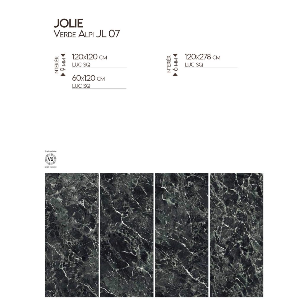 JL 07 Verde Alpi z kolekce Jewels 2.0 přináší dramatický a zároveň harmonický vzhled, inspirovaný intenzivními zelenými odstíny alpského mramoru. Tento jedinečný dekor je velmi detailní a jednotlivé žilkování plynule navazuje a dodává povrchu dojem autentického přírodního kamene. Lesklý povrch dlaždic umocňuje silné barvy a v interiérech vypadá velmi luxusně. JL 07 je ideální volbou pro koupelny, prostorné obývací pokoje či kuchyně, kde dokáže vytvořit výrazný designový prvek. Kromě toho jej lze využít ve vnitřních bazénech, wellness centrech či lázních, kde vytváří atmosféru klidu a elegance. V komerčních prostorech, jako jsou stylové restaurace, reprezentativní kanceláře či exkluzivní hotelové interiéry, podtrhuje JL 07 Verde Alpi smysl pro detail a současný design.