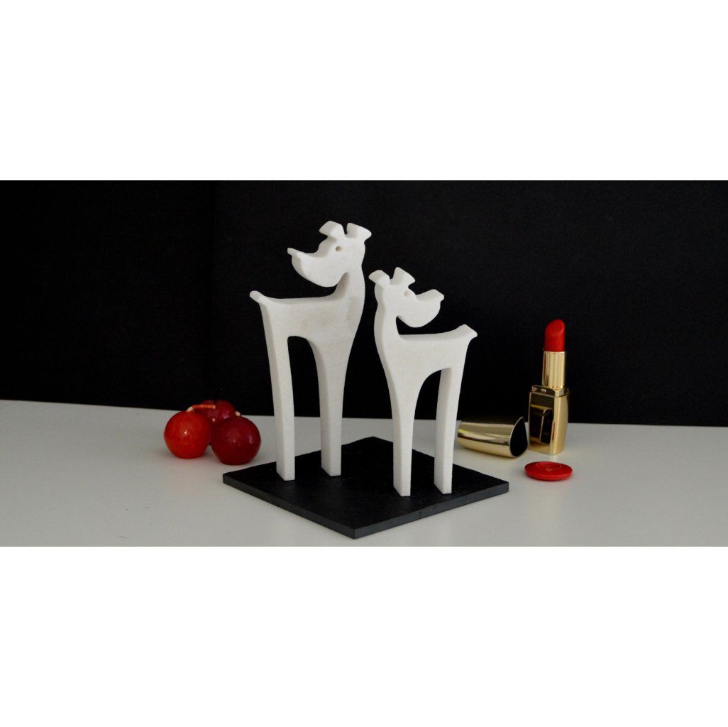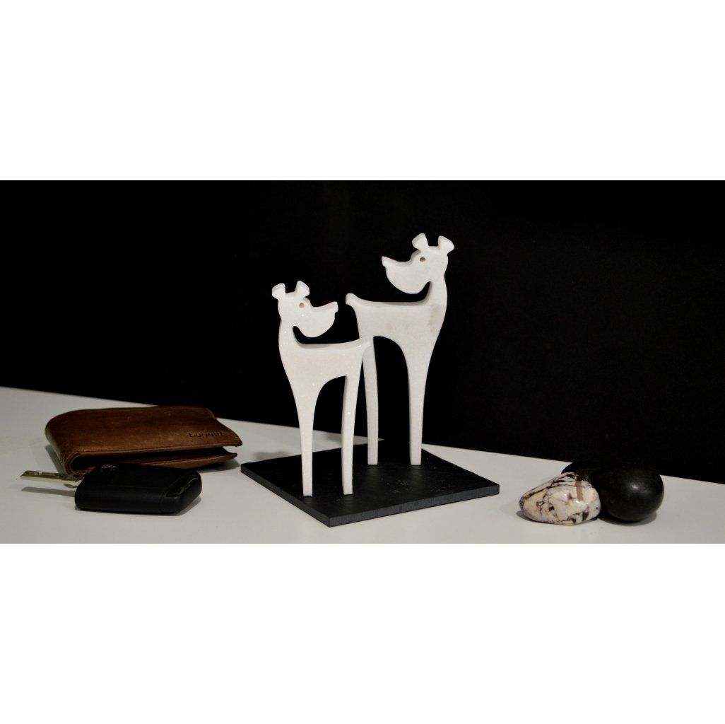 V balení obdržíte 2 pejsky vyrobené z bílého mramoru a destičku z přírodní břidlice, na níž si můžete sošky postavit, nebo přímo nalepit. Pokud máte doma místo, na něž by bylo vhodnější vystavit sošky bez tmavého podstavce, můžete tuto břidlicovou destičku použít třeba jako podtácek pro hrneček.